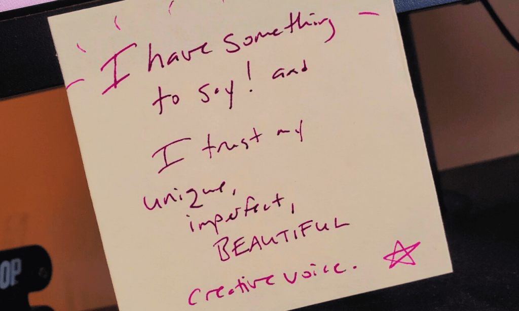 Repeat my mantra. And I’ve actually written it on a sticky note: “I have something to say, and I trust my unique, imperfect, beautiful creative voice.”